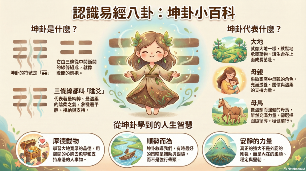 在《易經》的八卦家族中,如果說乾卦像天空一樣帶頭往前,那坤卦就像大地一樣,默默接住一切。坤卦代表的是土地、包容、配合與支持。它不搶風頭,卻沒有它,什麼都長不出來。