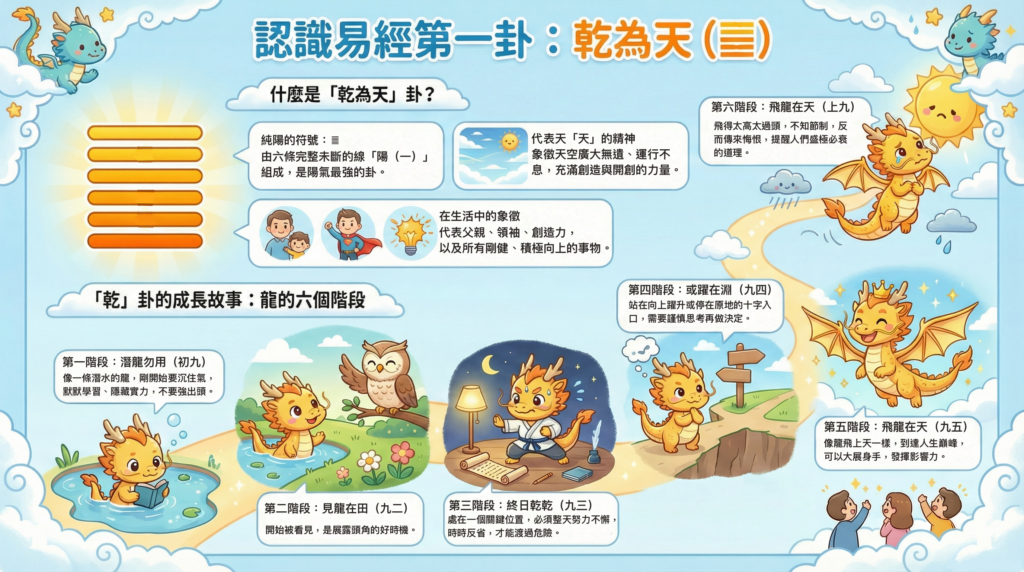 在《易經》裡,六十四卦就像一本教我們怎麼做人、怎麼做事的大書,而排在第一頁的,就是乾為天卦。它是第一卦,代表開始、創造、向前走的力量,就像故事一開始的主角。